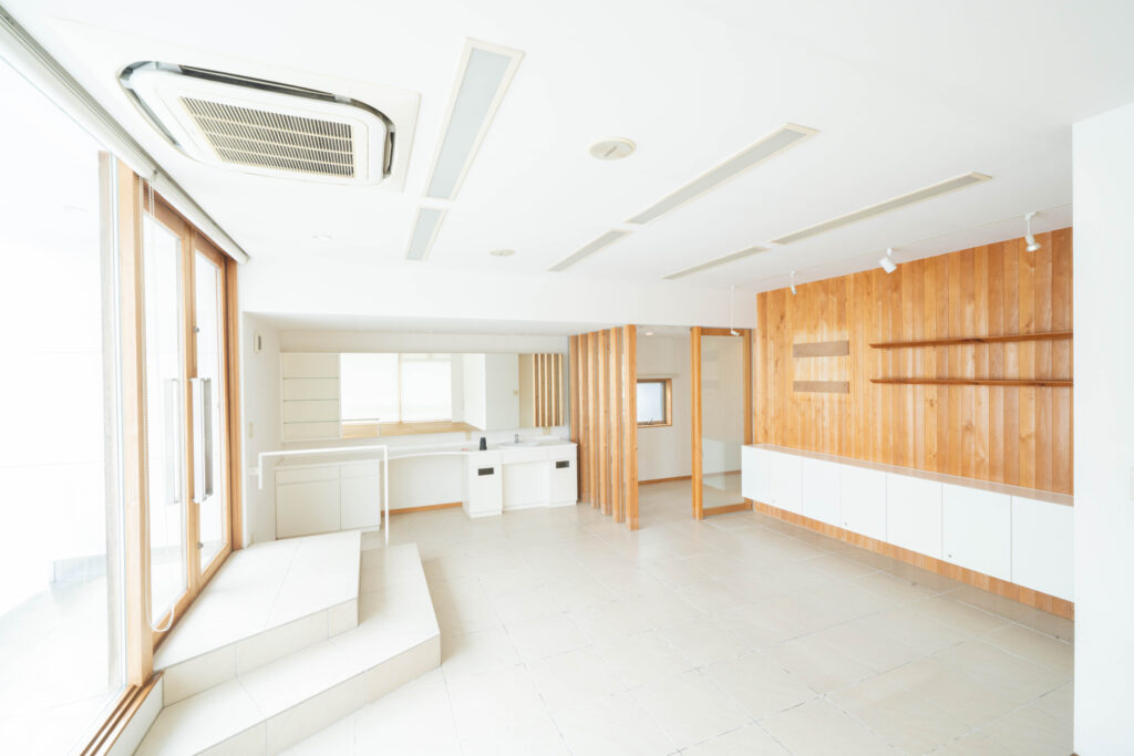 スタジオは建物の中の一室を利用します。光がたくさん入って明るくなるように窓を大きくとり、壁紙と床は白を基調としてさらに明るく開放感があるので、気持ちも開放的に撮影をしていただけます。